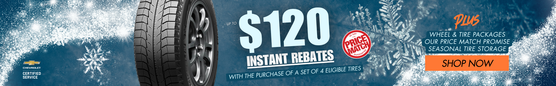 * Instant tire manufacturer rebates are available when you purchase four (4) identical eligible tires at participating Chevrolet, Buick, GMC and Cadillac dealers in Canada. Instant rebates available: $120 on Bridgestone winter tires, $90 on Firestone winter tires, $80 on Continental winter tires (including SecureContact AW), $70 on Michelin tires, $70 on Pirelli tires, $60 on Hankook winter tires, $50 on BFGoodrich tires, and $40 on General winter tires (including AltiMAX 365 AW). Offer is valid from September 1, 2025 to December 31, 2025. This offer is non-transferable and may not be combined with other offers. Installation and balancing are extra. Limit of 1 instant tire manufacturer rebate per VIN. Conditions and limitations apply. Offer may not apply to tires on all GM models; see participating dealers for details. No rain checks available. This offer may be changed, cancelled or extended at any time without notice.
